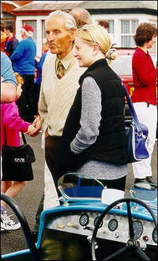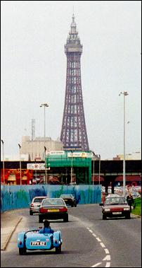 The blue car driving off towards Blackpool Tower is 'TVR 2', the oldest survivor of the marque. The tanned gentleman standing next to it in the other photo is its creator, Trevor Wilkinson. Page 1 has more photos of TVR 2.